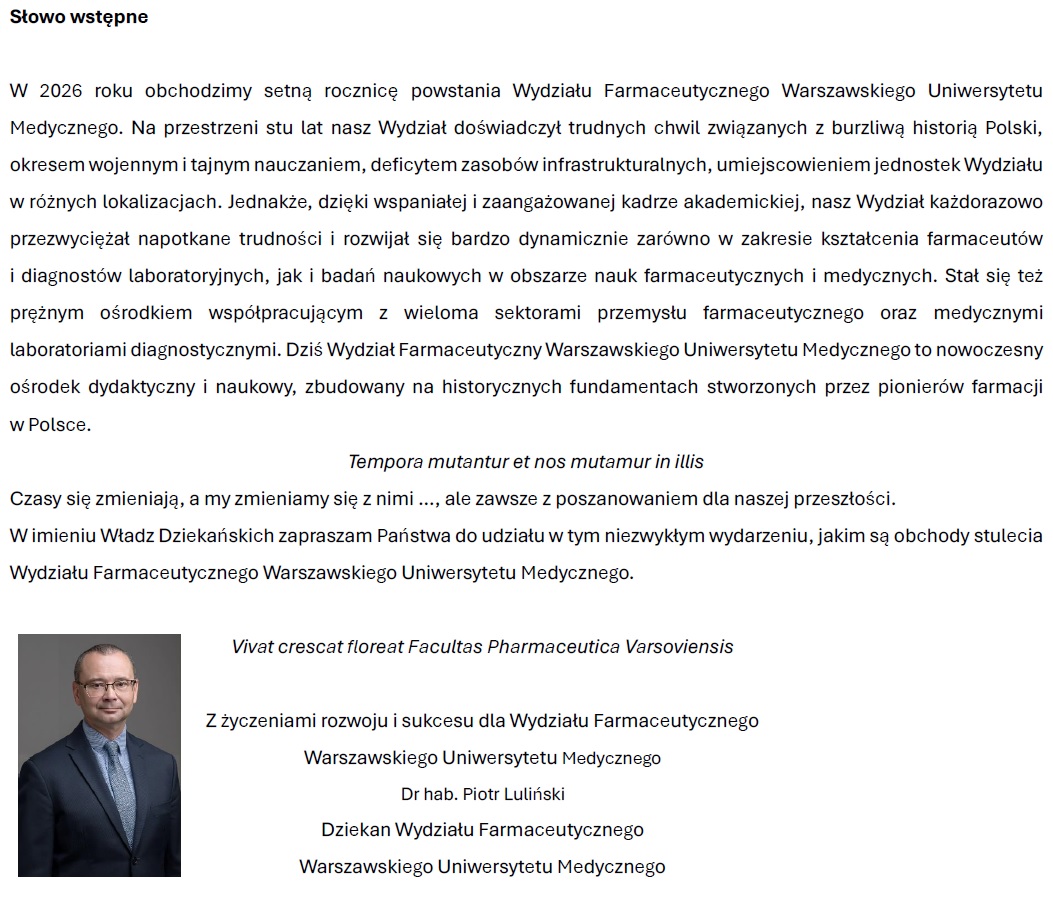 Zaproszenie na uroczystość otwarcia Roku Jubileuszowego 100-lecia Wydziału Farmaceutycznego